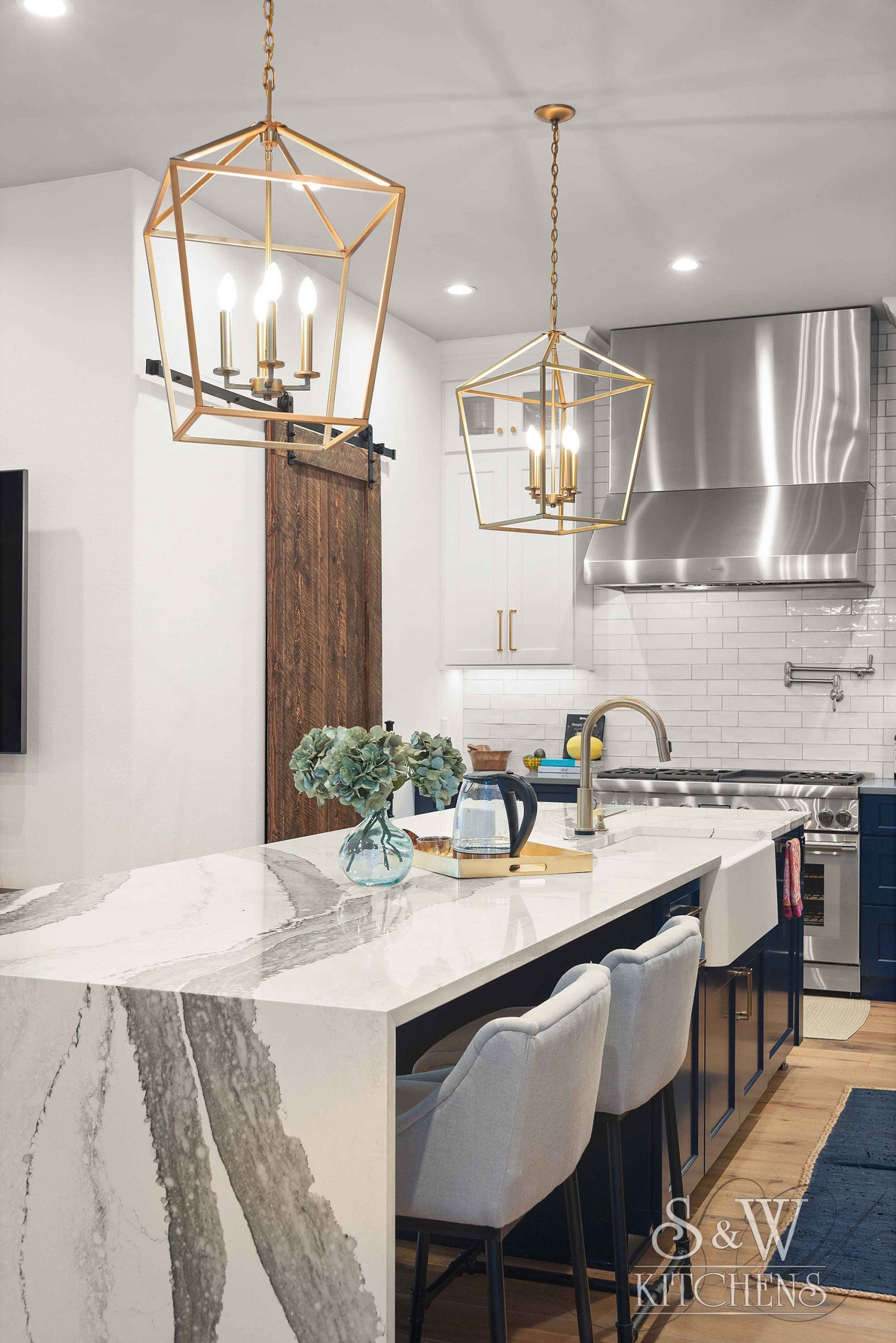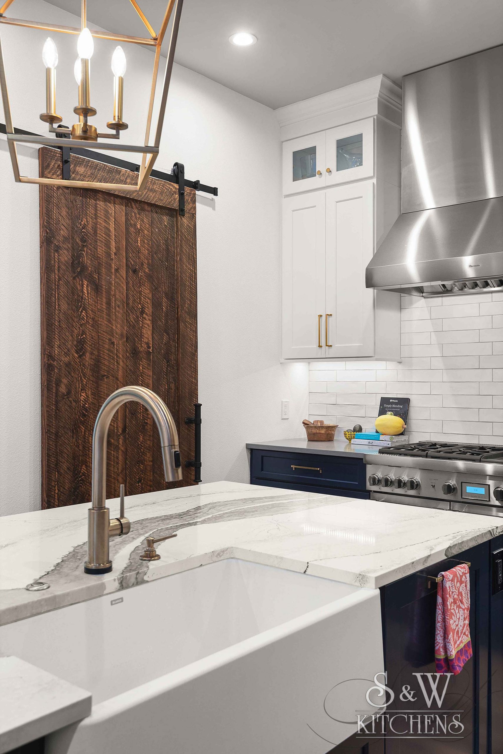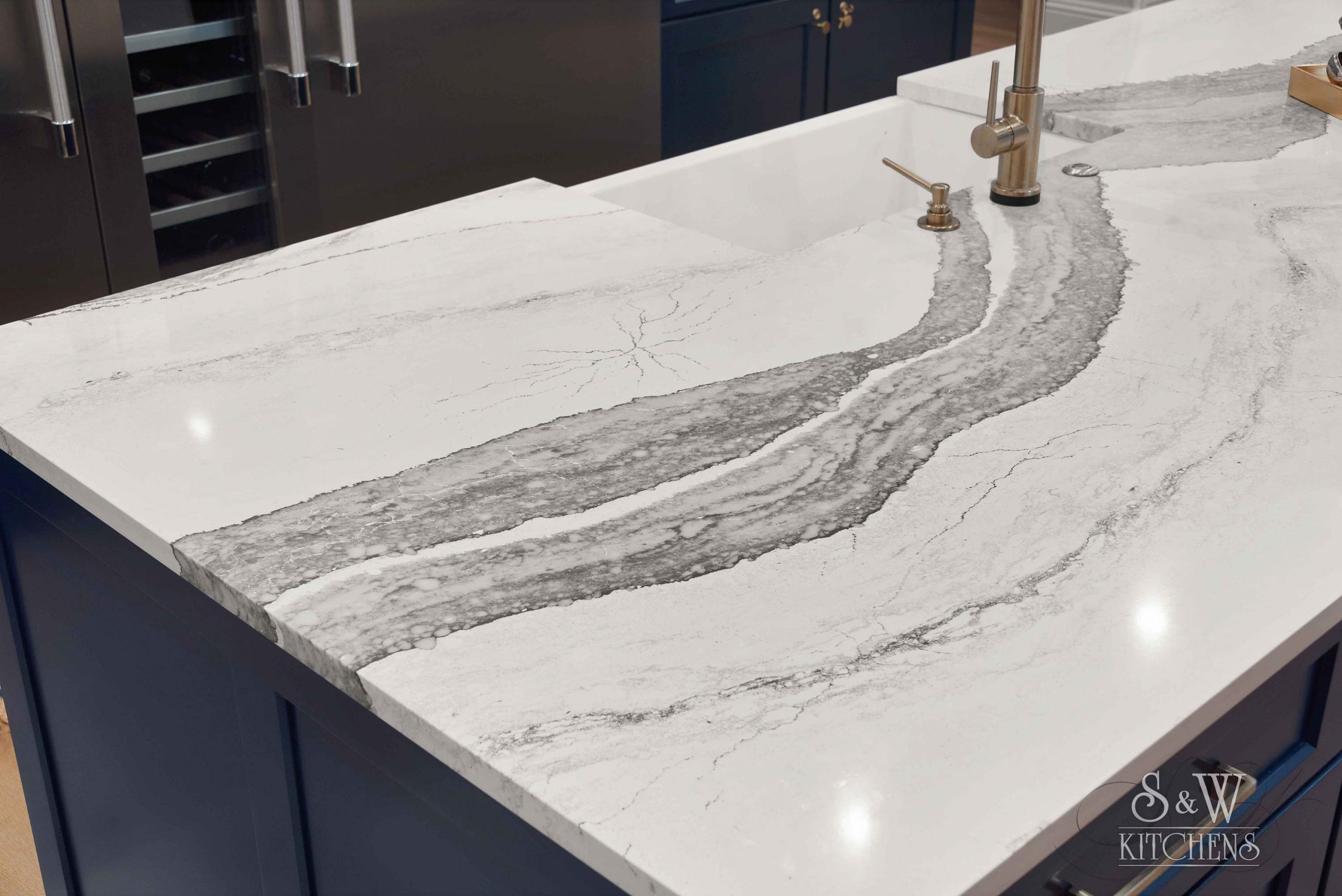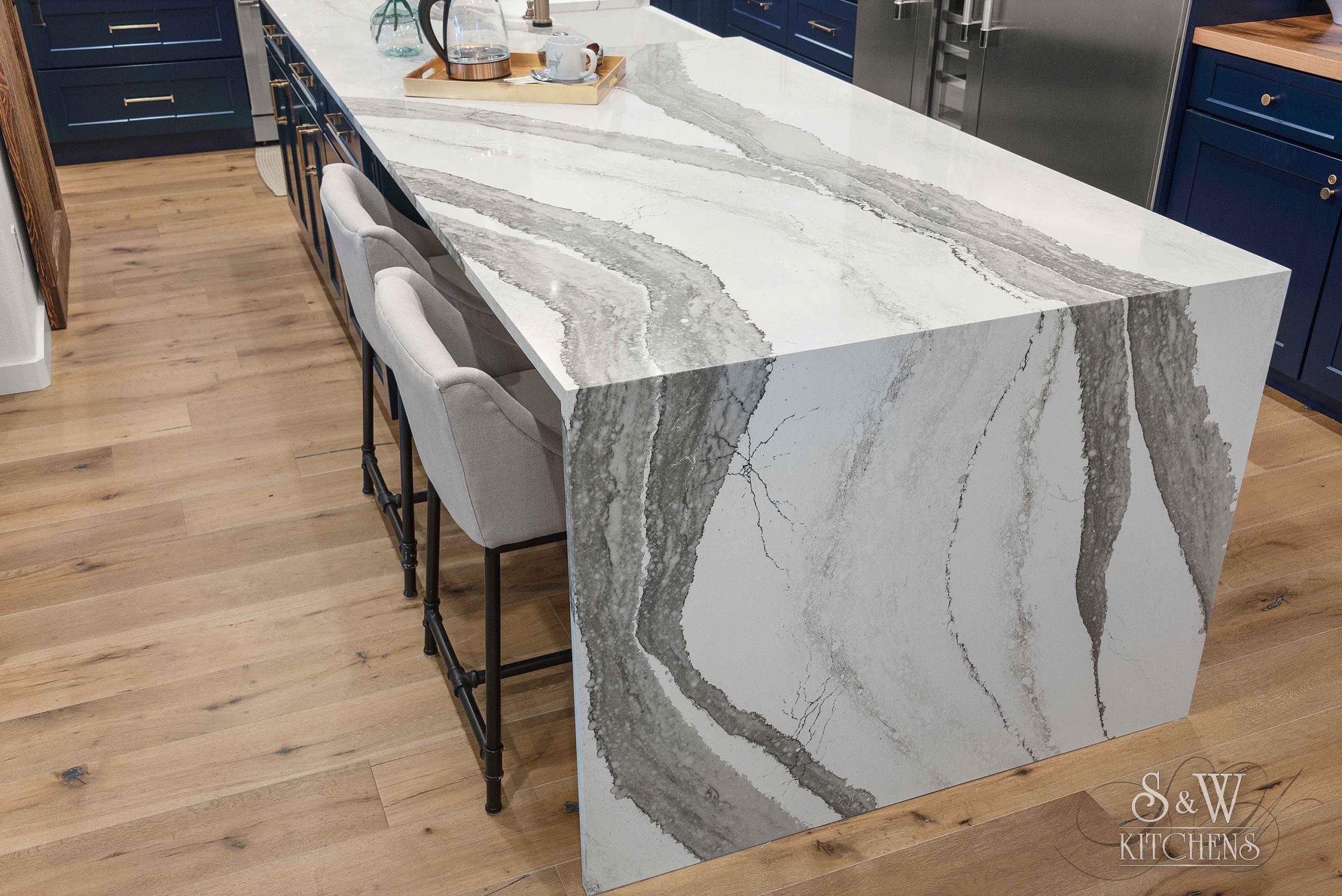 Island: Cambria Skara Brae; Perimeter: Caesarstone Pebble; Grothouse Reclaimed Oak