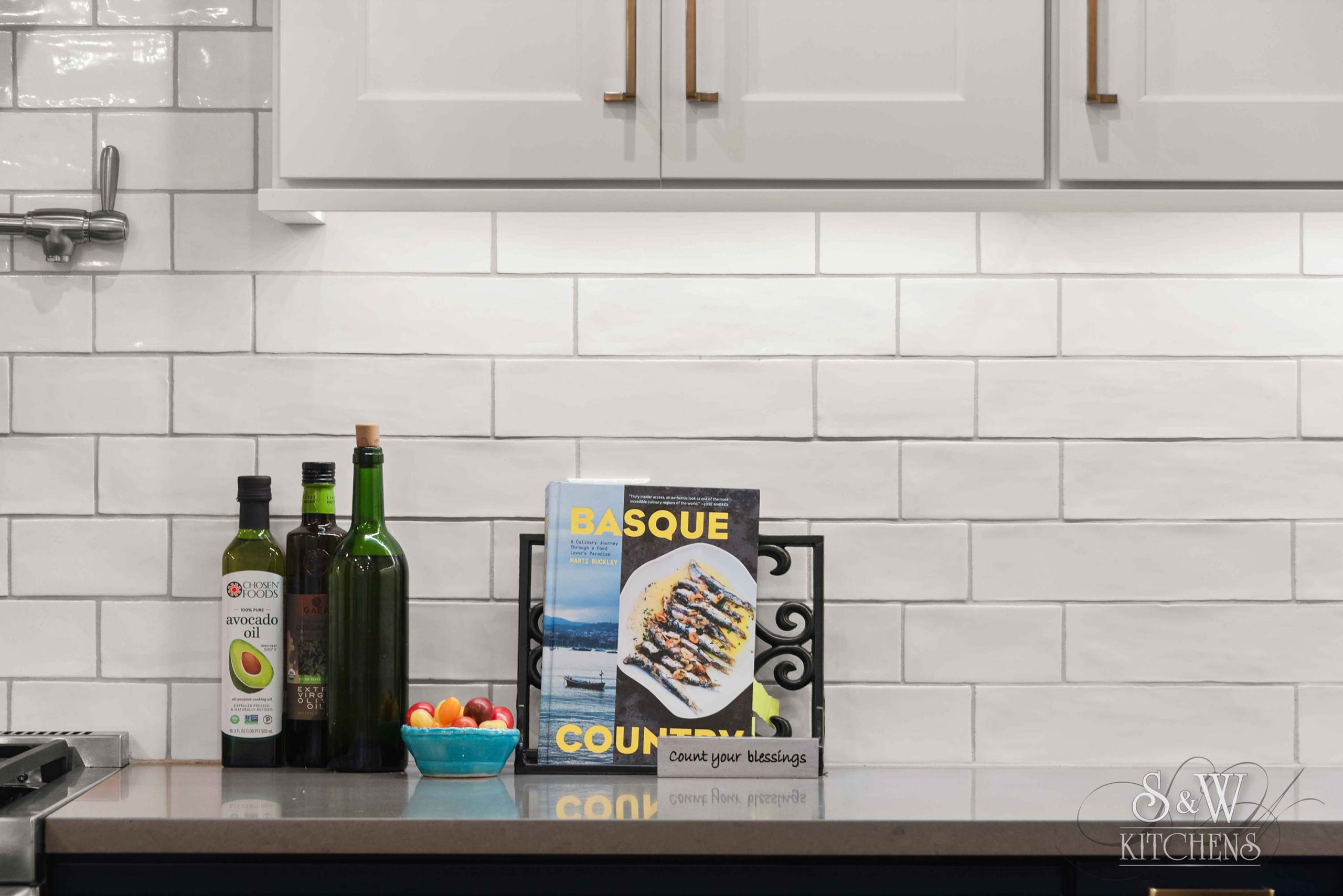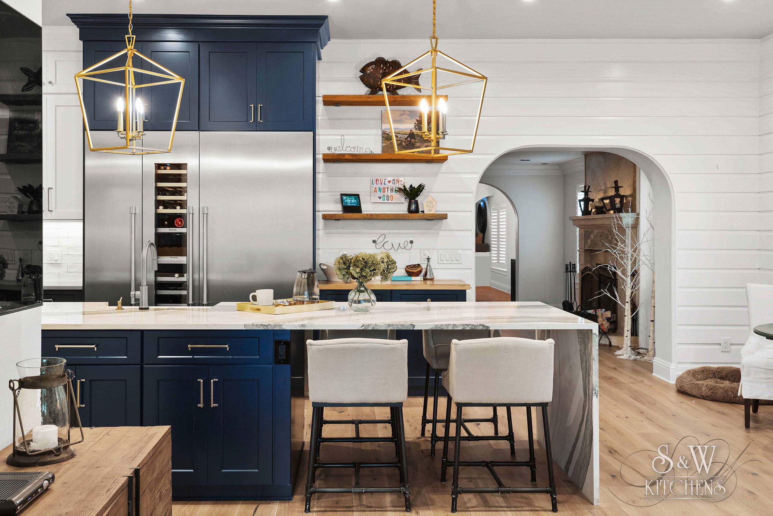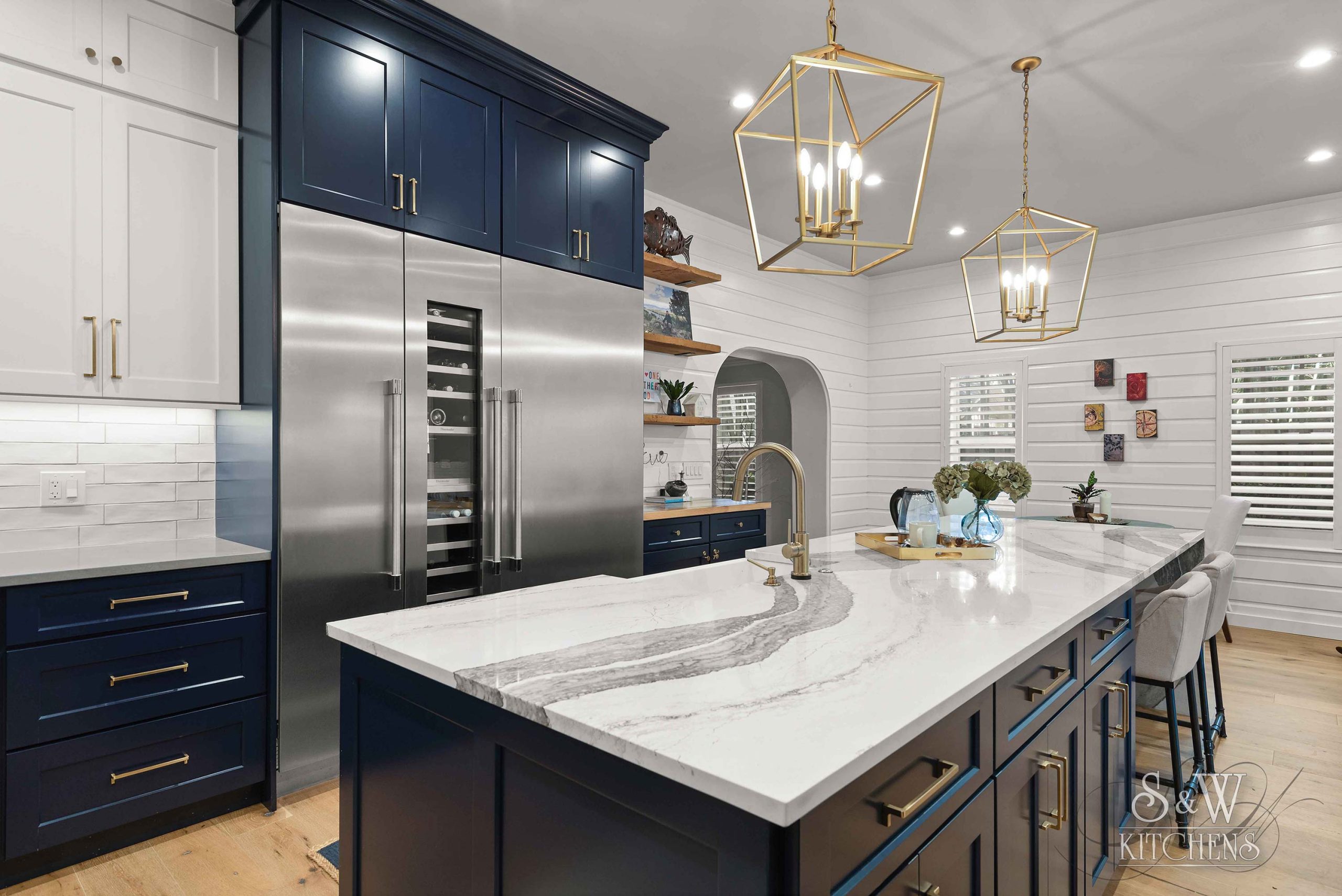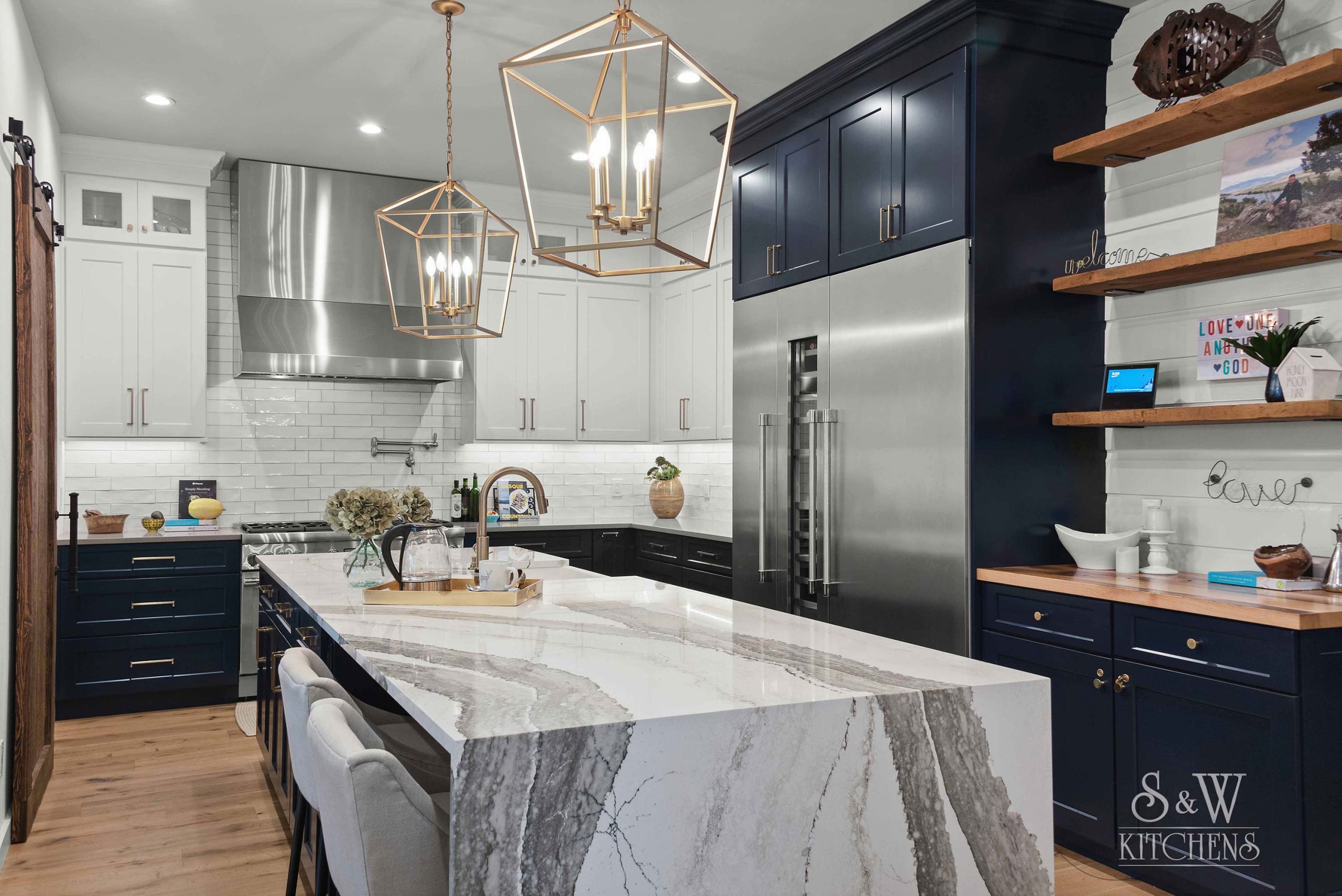 Island: Cambria Skara Brae; Perimeter: Caesarstone Pebble; Grothouse Reclaimed Oak