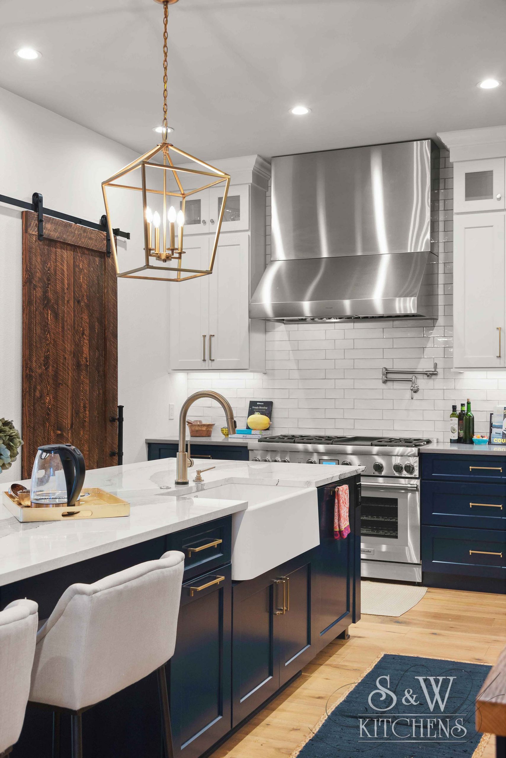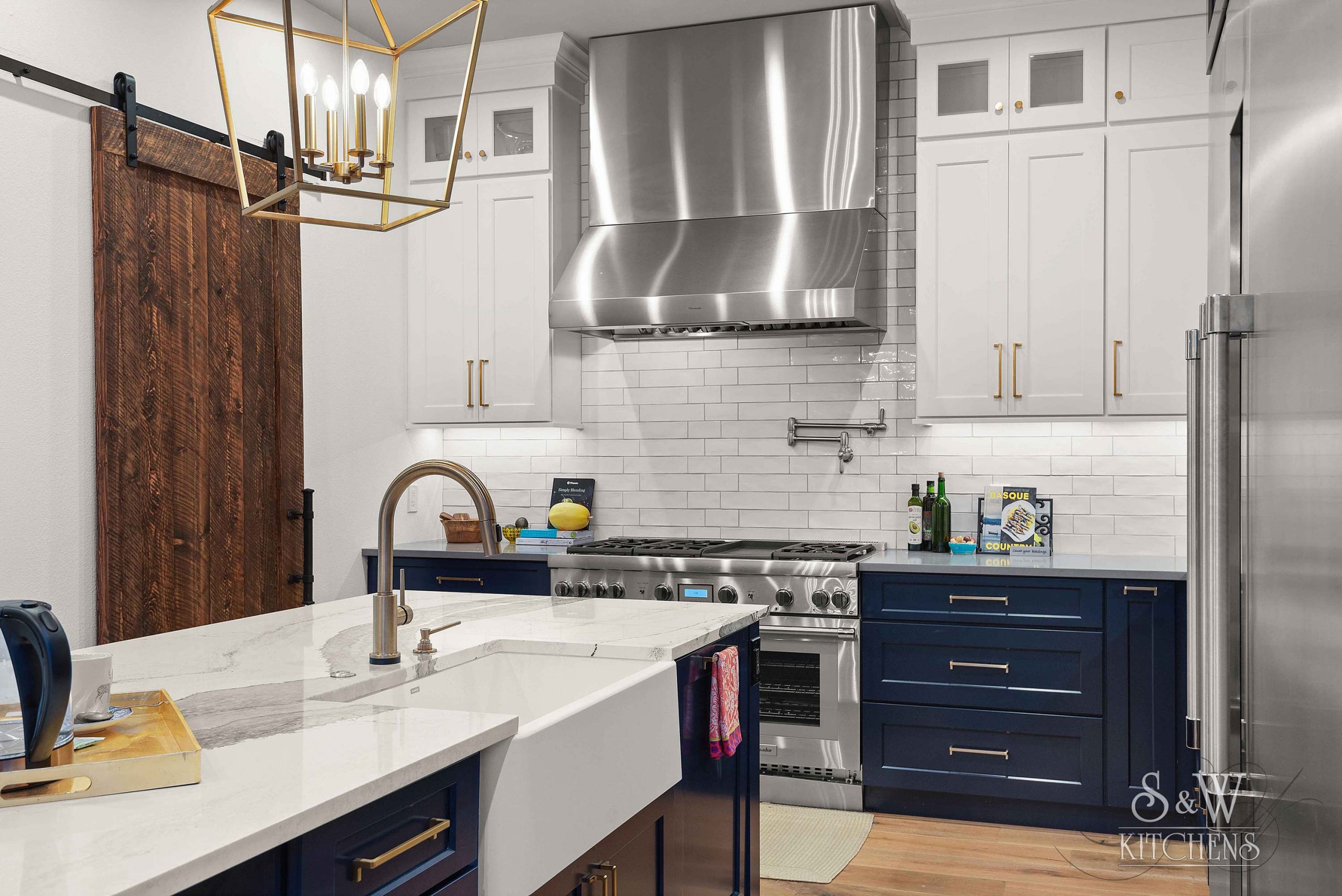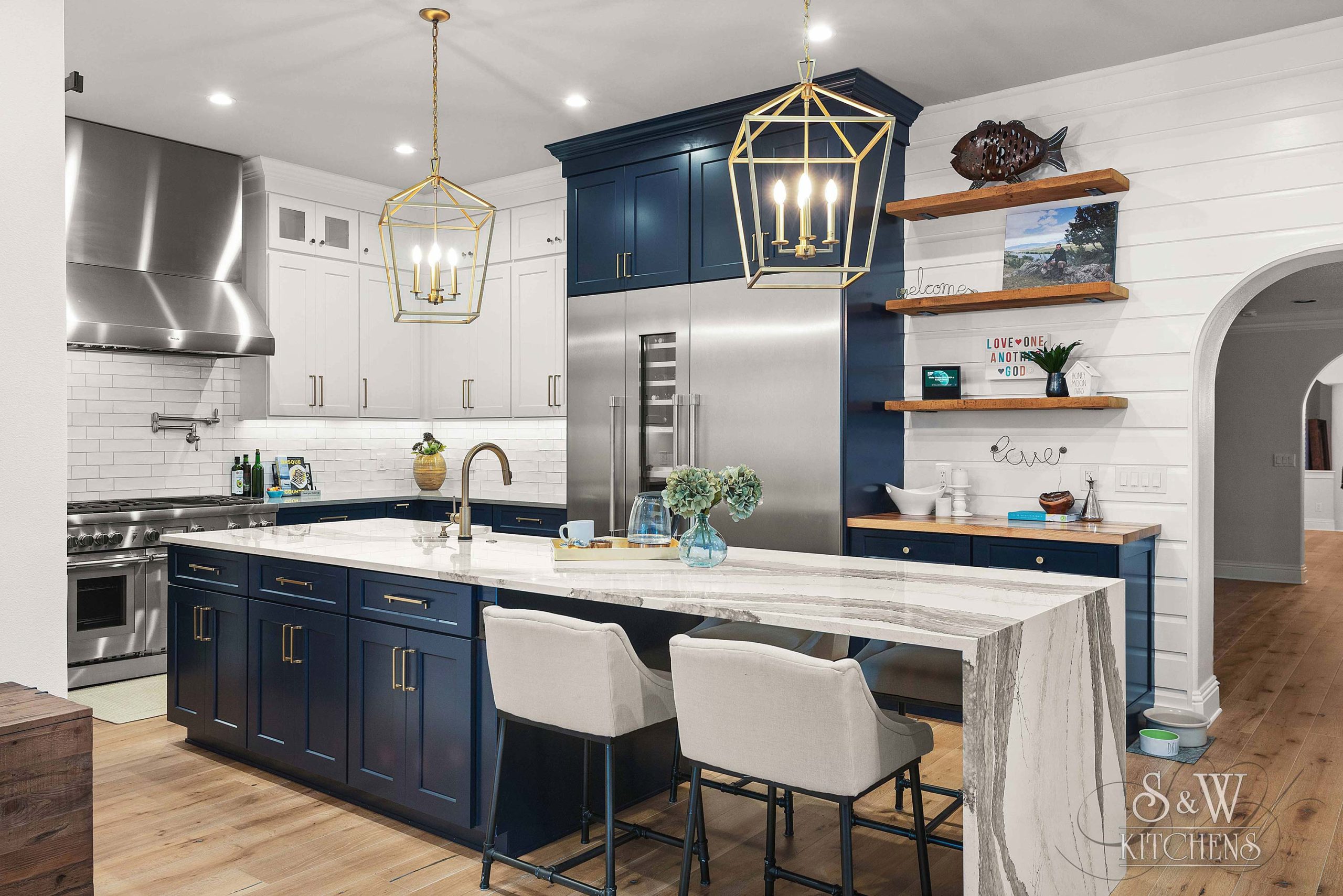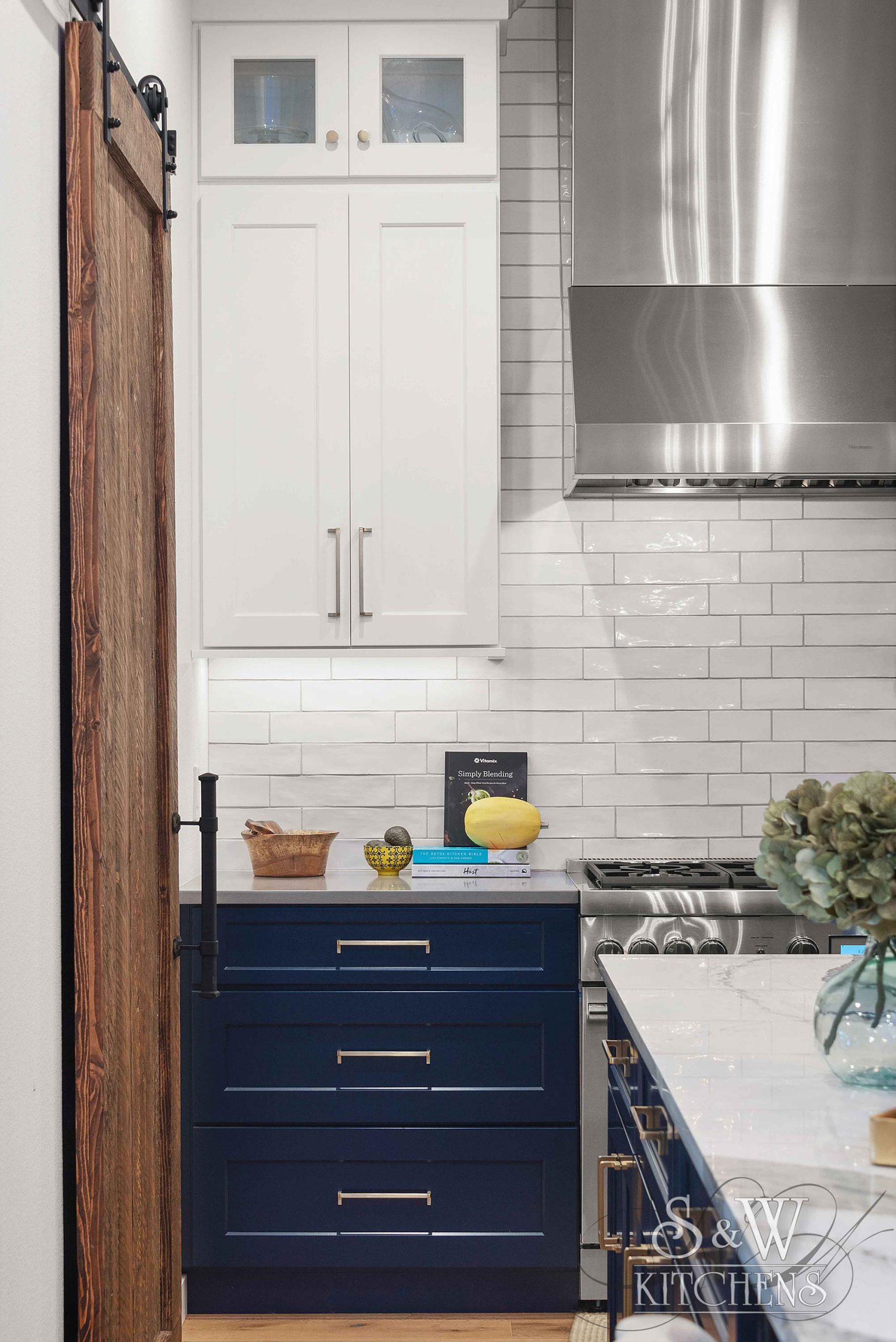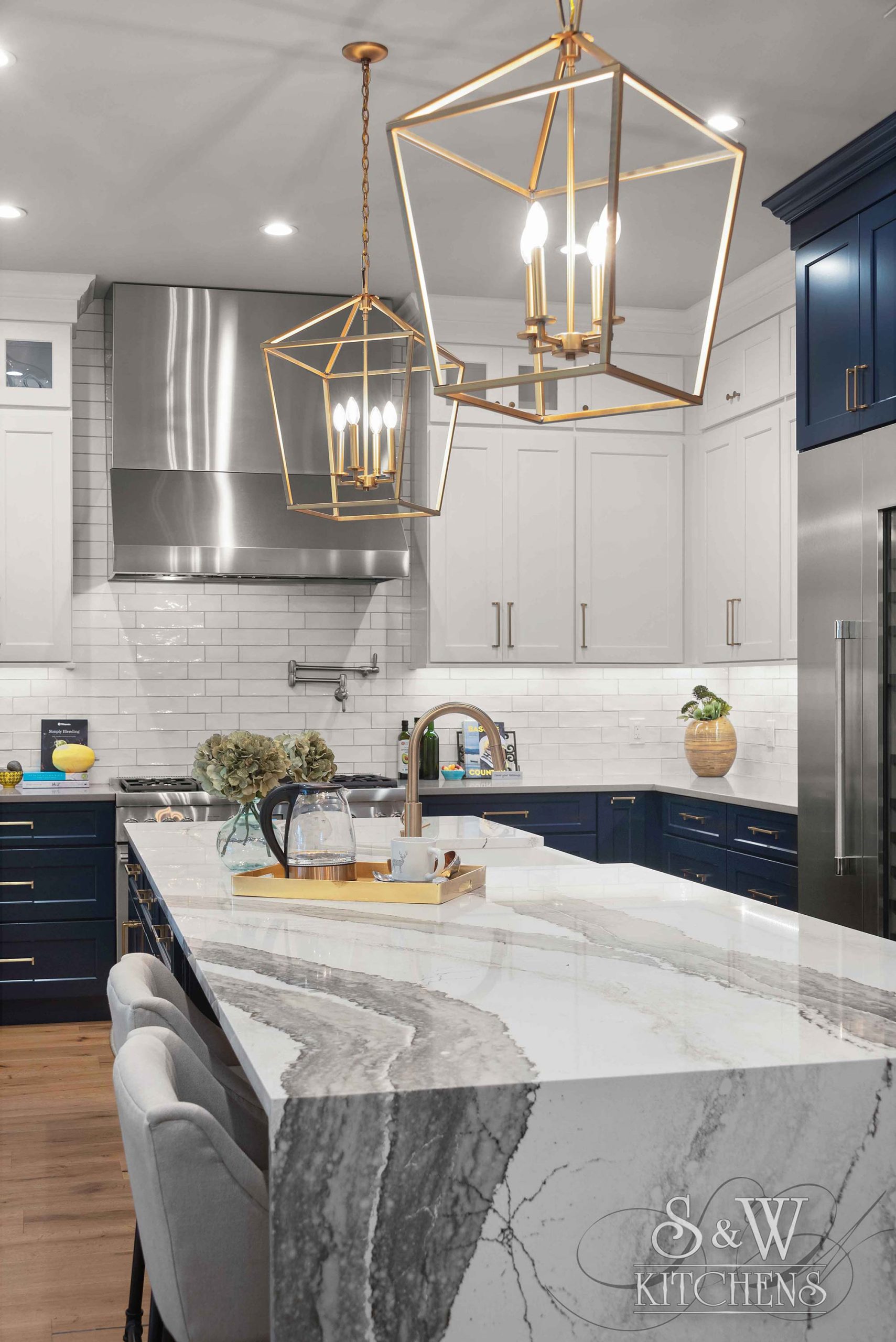 Island: Cambria Skara Brae; Perimeter: Caesarstone Pebble; Grothouse Reclaimed Oak