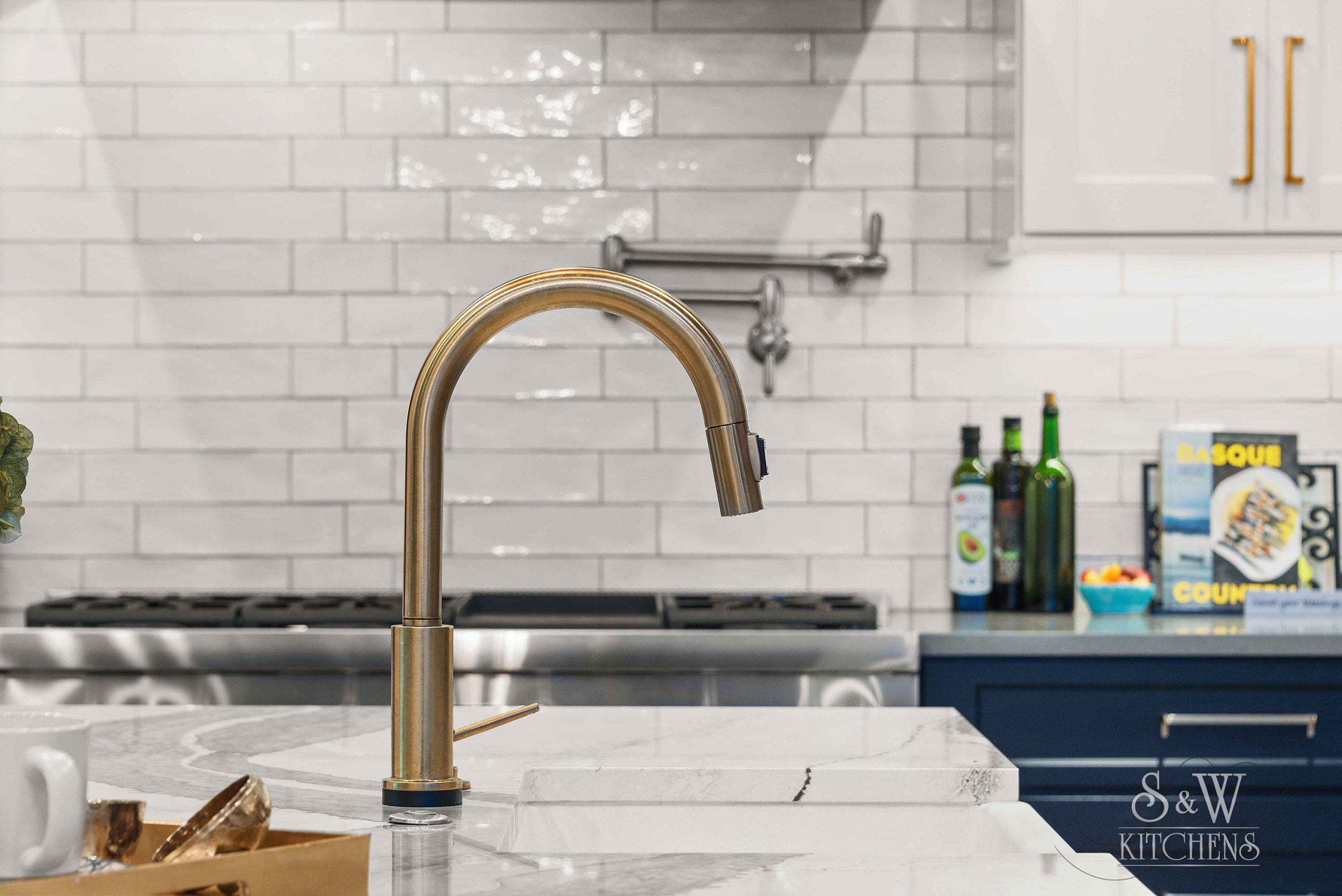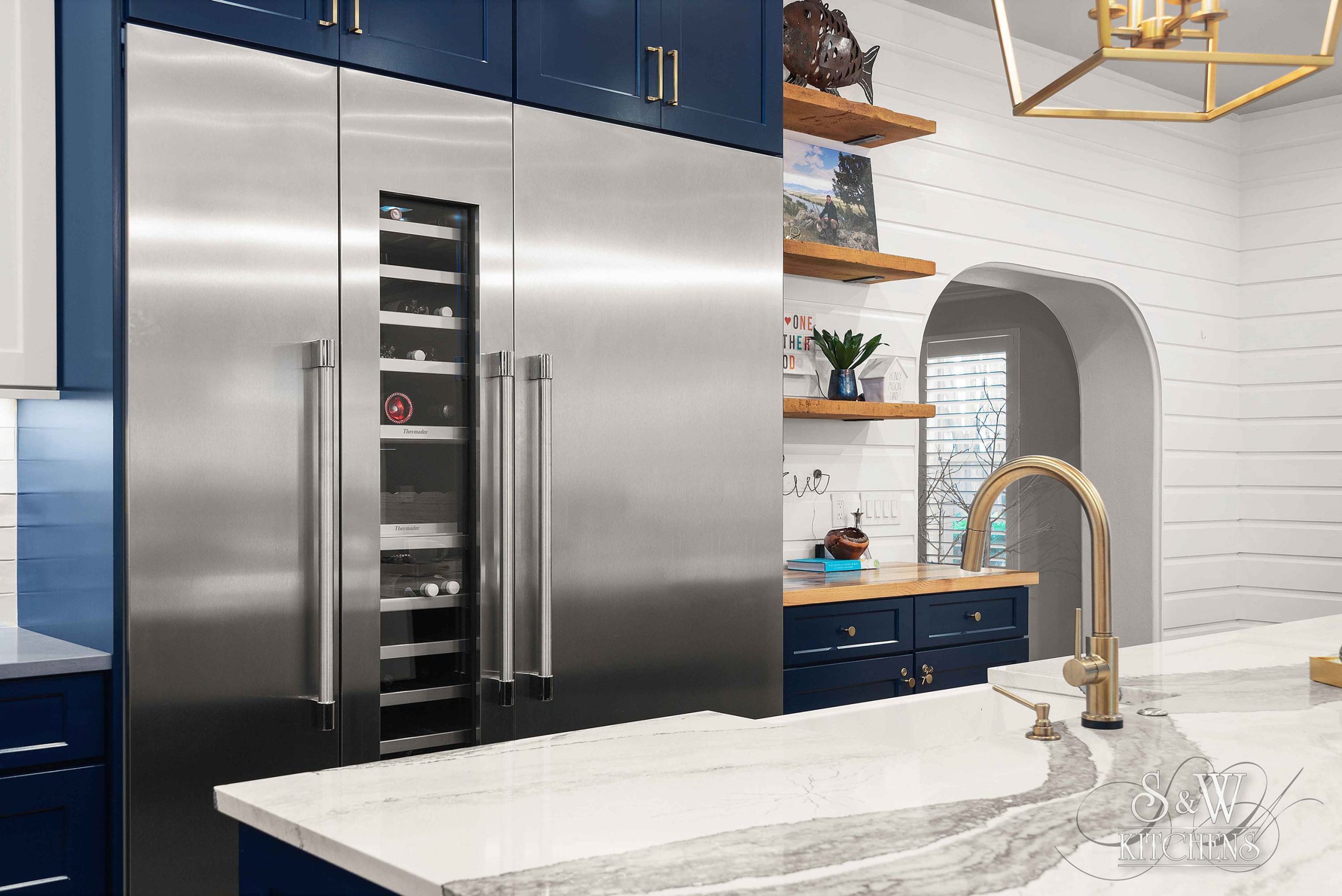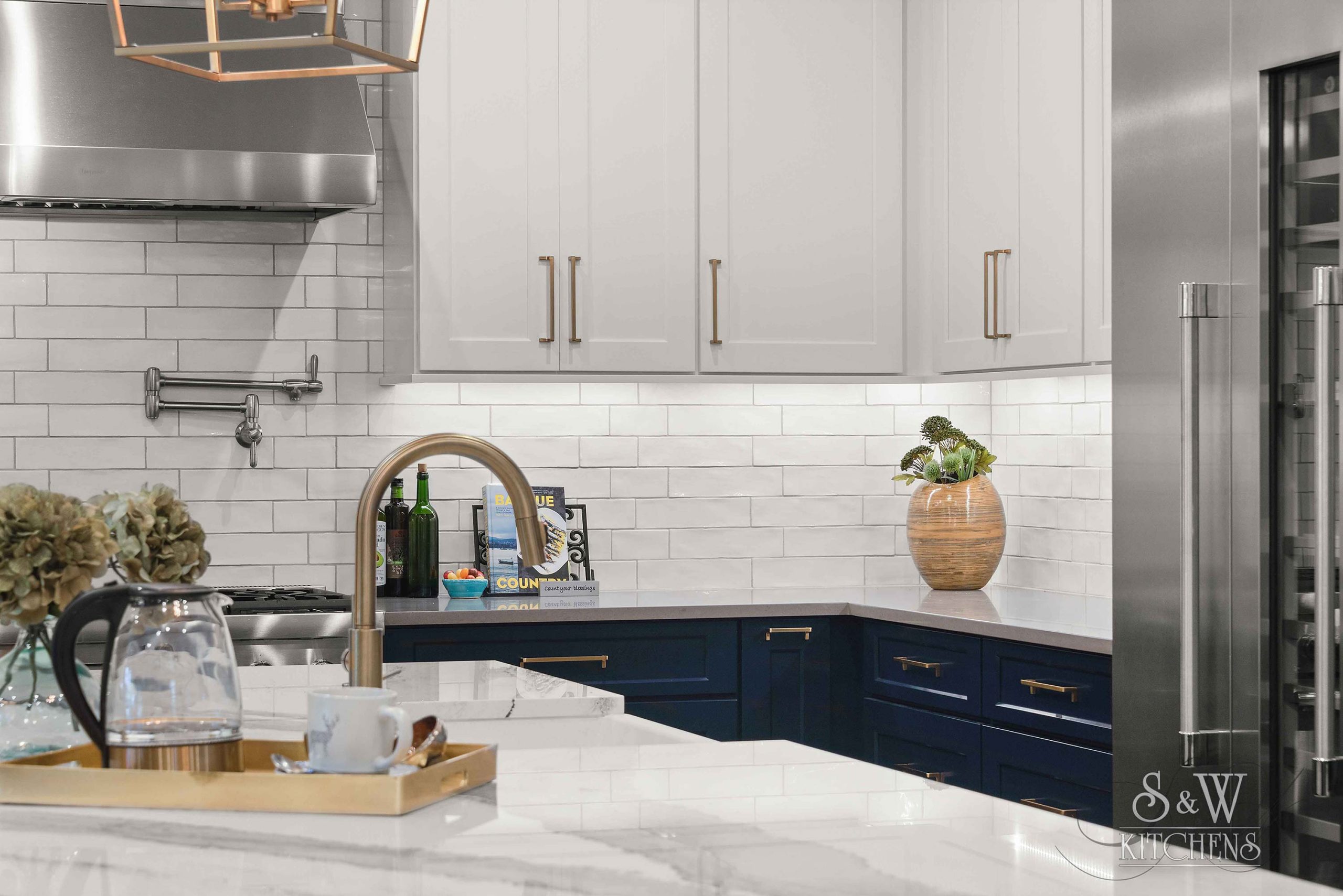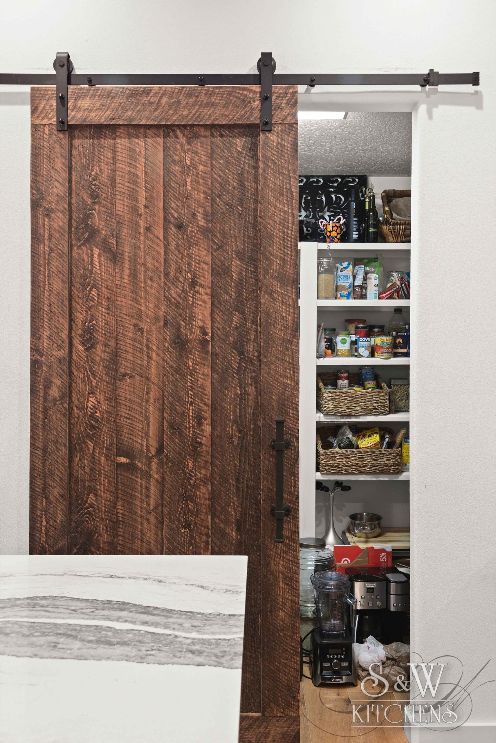 Island: Cambria Skara Brae; Perimeter: Caesarstone Pebble; Grothouse Reclaimed Oak