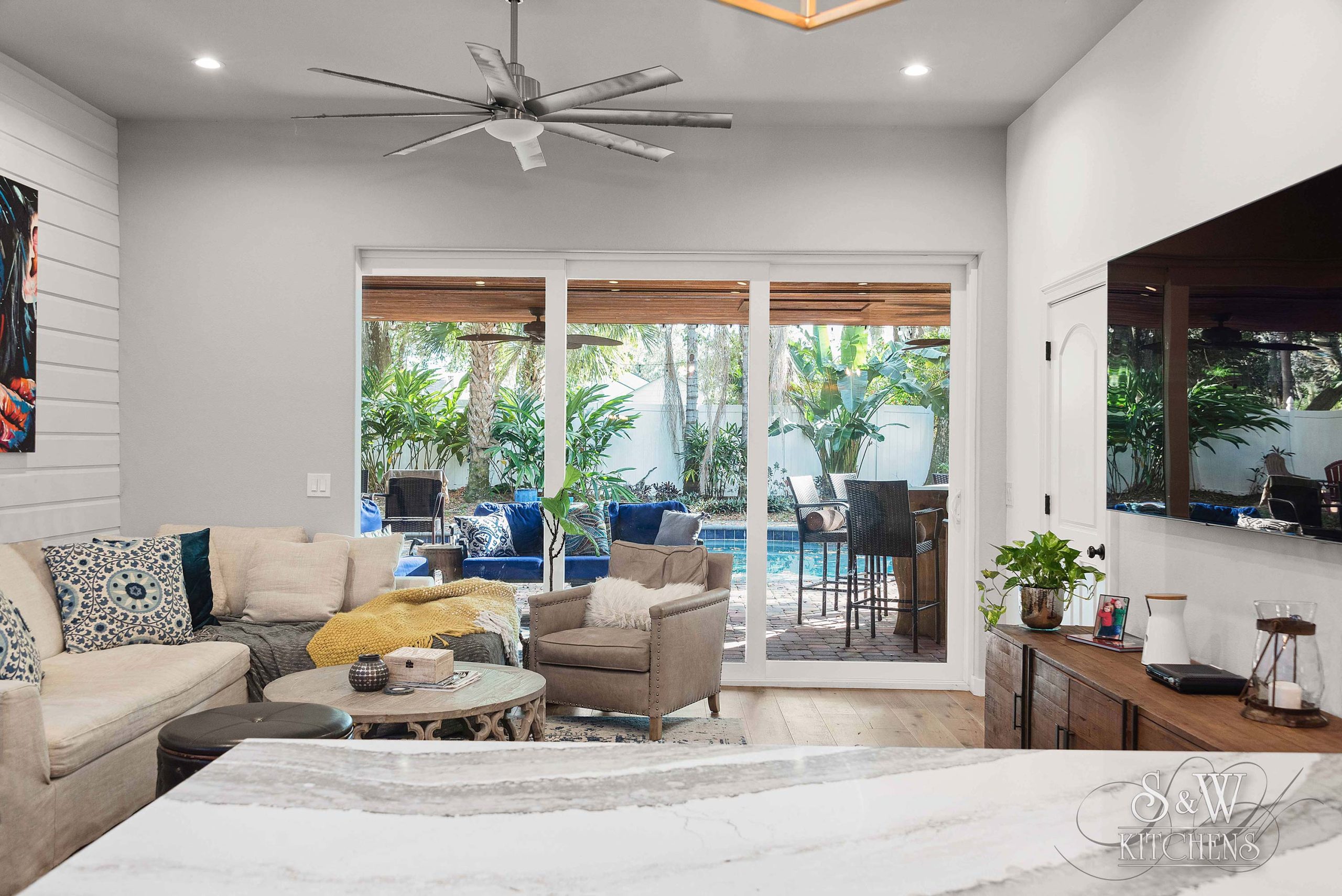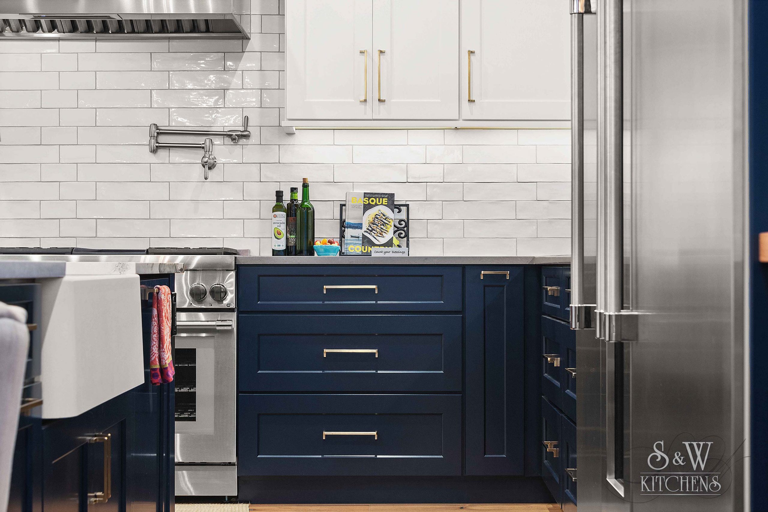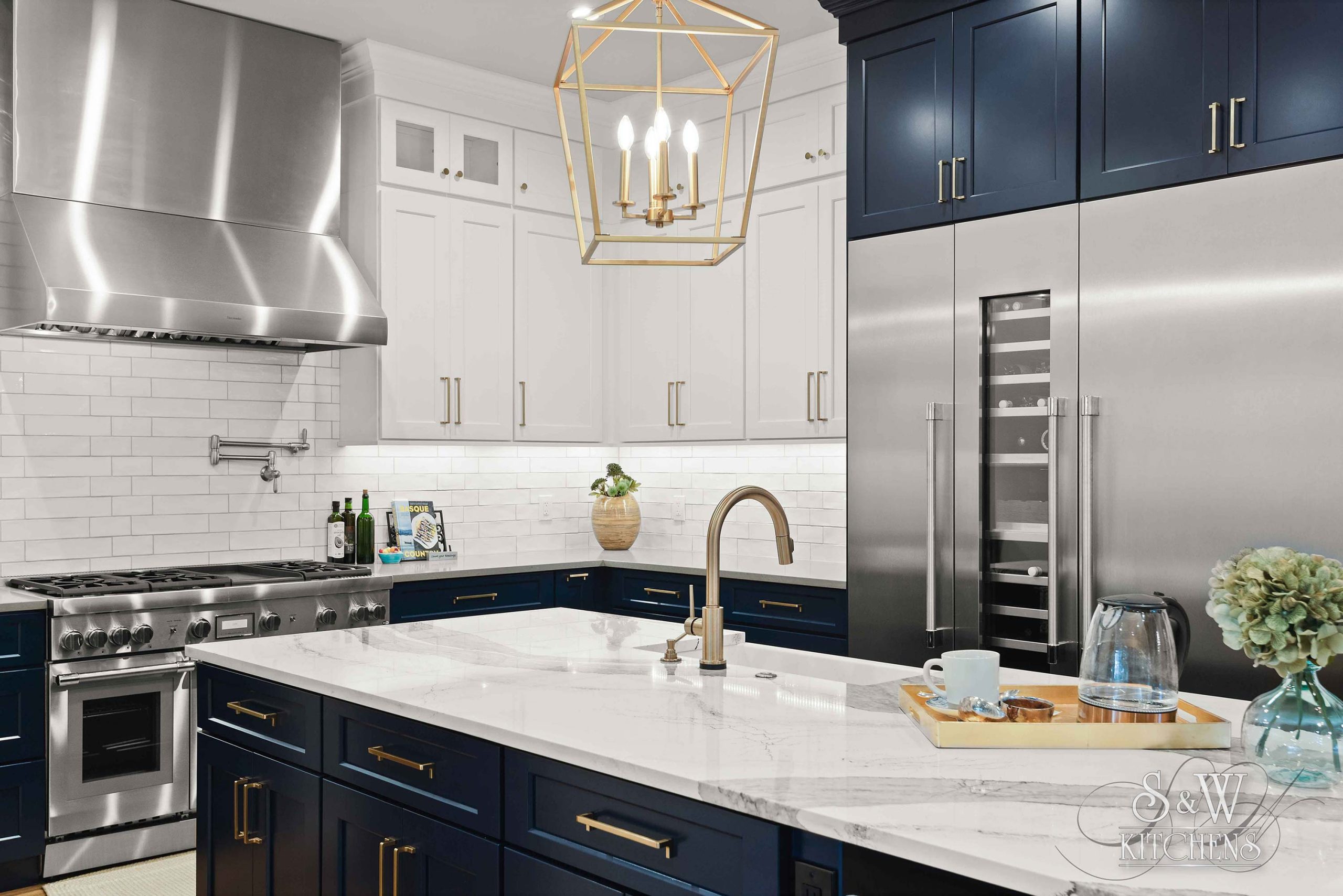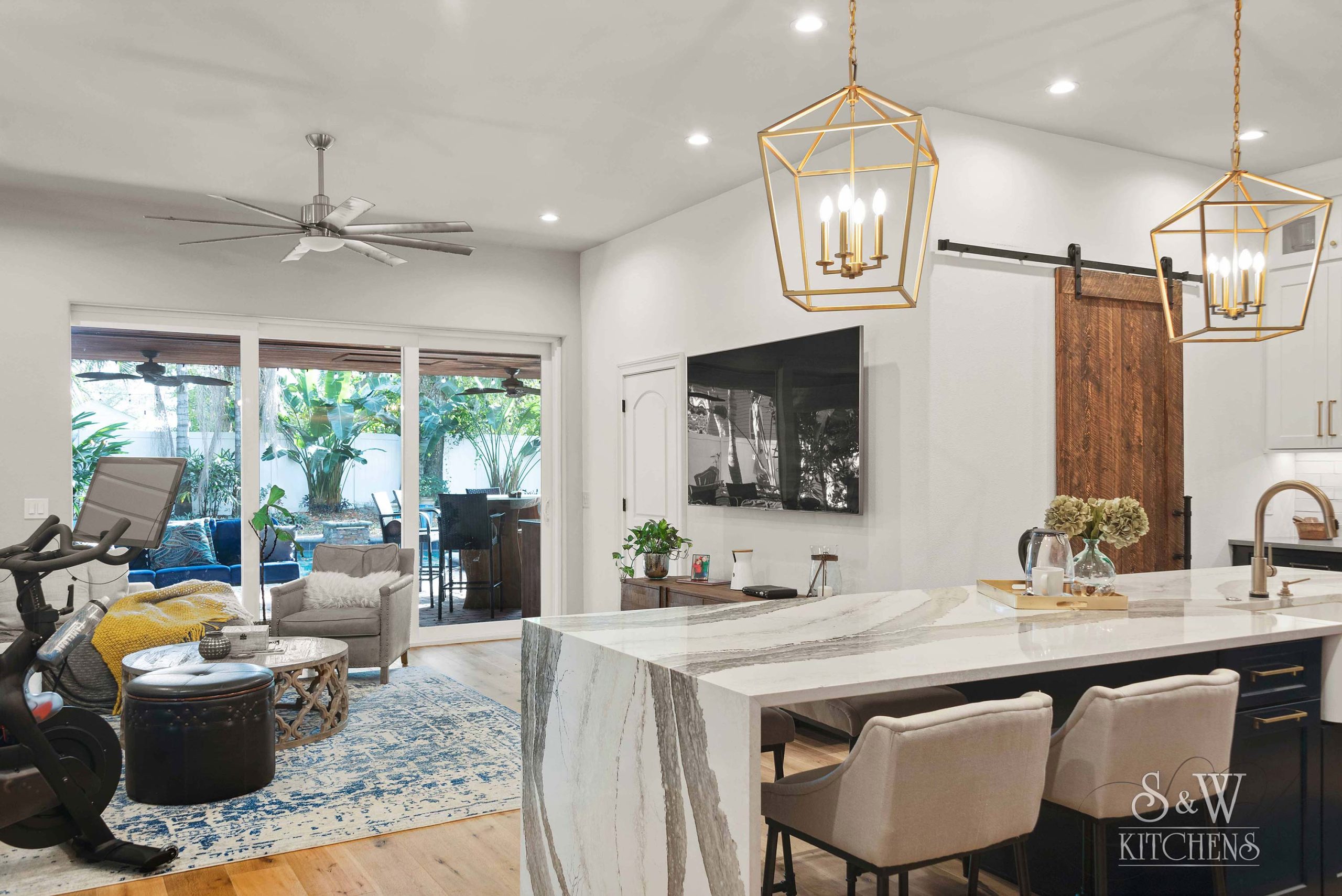 Island: Cambria Skara Brae; Perimeter: Caesarstone Pebble; Grothouse Reclaimed Oak
